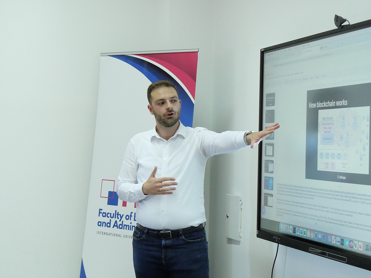 On Tuesday, April 29, 2025, the IUS Faculty of Business and Administration (FBA) hosted a lecture titled “DeFi and the Future of Finance: Blockchain Foundations and Economic Concepts.” The guest lecturer, Mr. Ajdin Kahrović, Engineering Manager at the DeFi app, delivered an insightful session exploring the rapid evolution of decentralized finance (DeFi) and its impact on global financial systems.